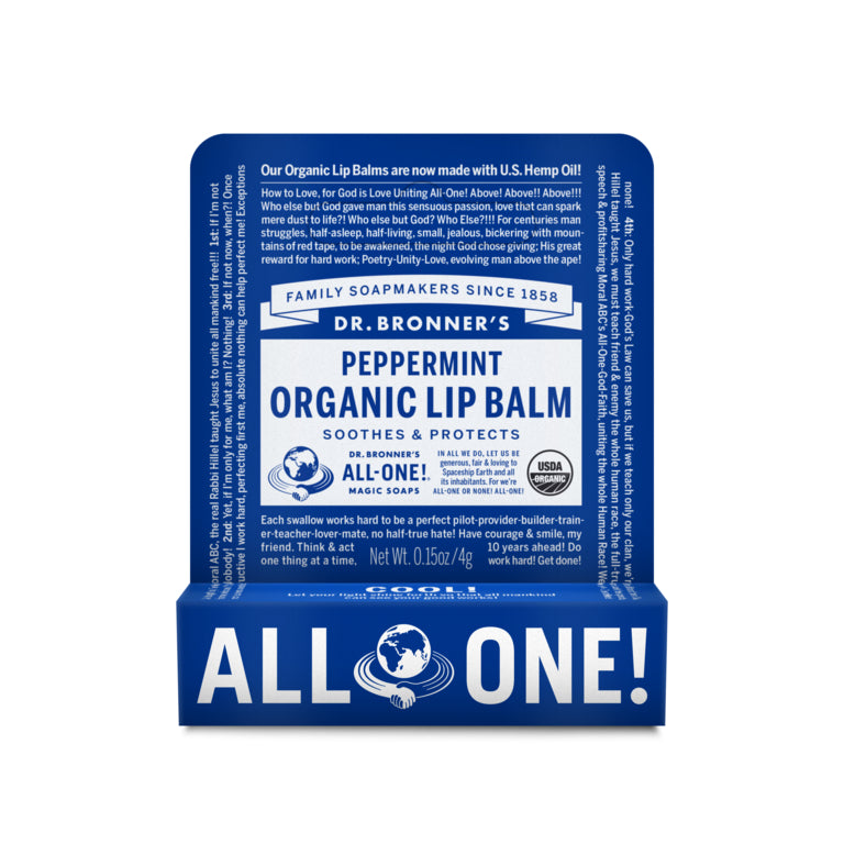 Dr. Bronner's Organic Lip Balms, made with organic beeswax, provide a protective barrier to the elements with no synthetic ingredients! None! Organic jojoba, avocado and hemp oils help with extra moisturization. Only the finest essential oils are used for fragrance. Certified organic to USDA National Organic Program standards, because what you put on your lips goes into your body.